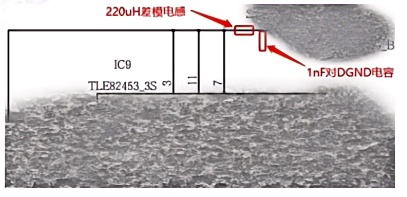 1.分別在芯片IC8、IC9、IC10的電源輸入端增加220uH貼片差模電感,并在差模電感遠(yuǎn)離芯片端增加1nF對(duì)DGND電容。