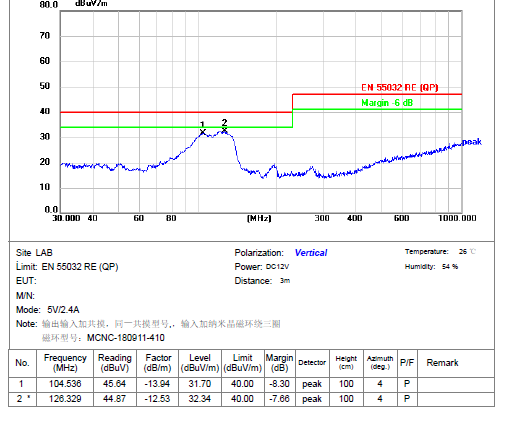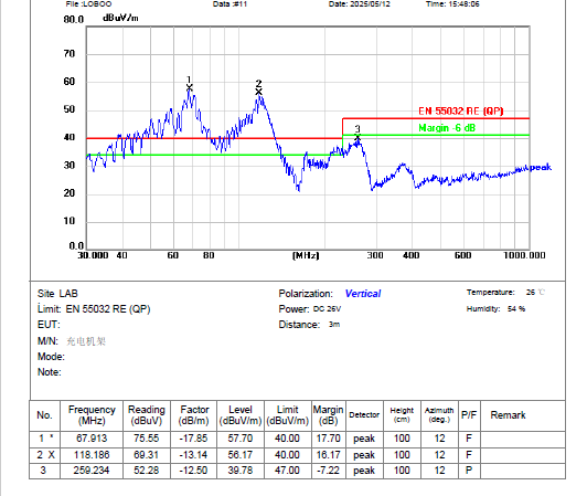 四、整改后效果:67MHz 和118MHz頻段輻射值余量大于7dB,完全滿足標準要求;